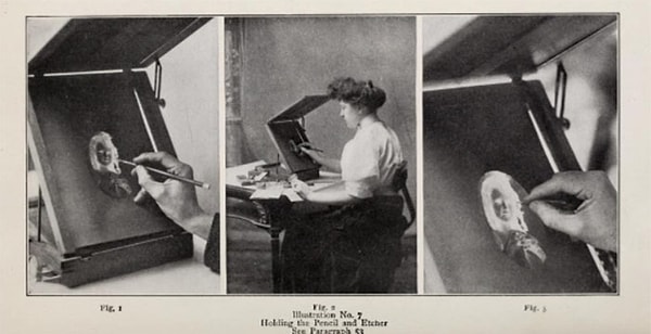 Когда дело доходит до методов ретуши, фотографы использовали инструменты, которые сильно отличались от приложений, которые мы используем сегодня. В их состав входили: мольберт, увеличительное стекло, держатель для грифеля, грифель, нож для гравировки, кисть для пятен, жидкость для ретуширования, негативный лак и паста для гравирования.