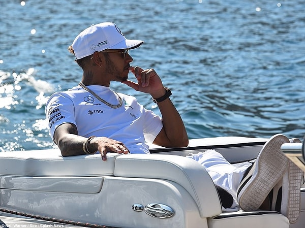 6. Хэмилтон в свою очередь разделся до пояса, демонстрируя свою коллекцию татуировок, не позабыв защитить голову от солнца с помощью белой кепки.