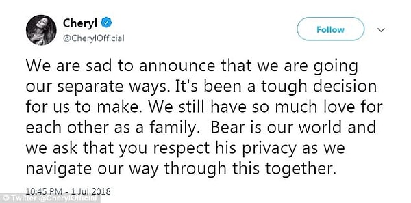 2. О расставании Шерил объявила на своей страничке Twitter с 7 млн подписчиков вчера вечером.