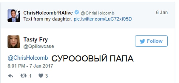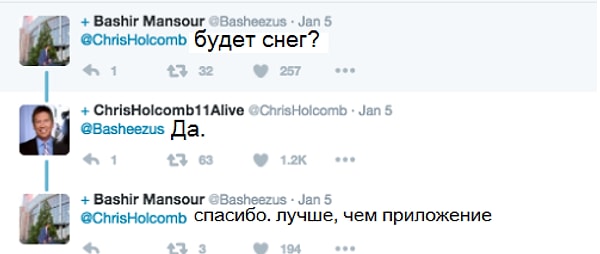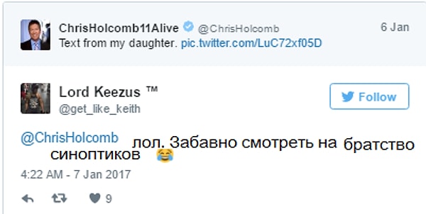 Крис Холкомб, метеоролог из Атланты, предупредил свою дочь о том, что скоро должен начаться сильный снегопад. Она написала в ответ, что приложение говорит об обратном. И вот как отреагировал на это синоптик: