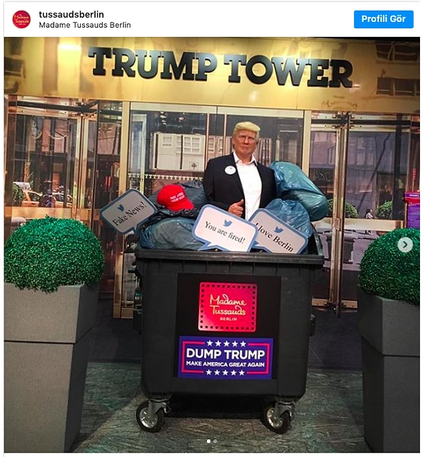 Музей мадам Тюссо в Берлине 30 октября разместил на своей странице в Instagram фото и видео, на которых запечатлена восковая статуя Трампа, помещенная в мусорное ведро. В сообщении было заявлено, что Трамп был убран, чтобы освободить место для избрания нового президента в США.