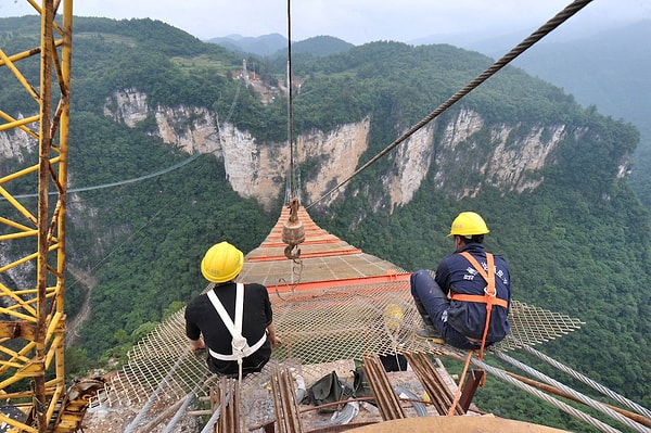 300-метровый стеклянный мост для туристов, перекинутый между двумя вершинами, находится в китайской провинции Хунань. Мост сооружен на высоте 180 метров. Что, уже страшно? :) Не бойтесь: стекло достаточно плотное и способно выдержать порывы ветра до 220 метров в секунду. А для посетителей, которым от этого не становится легче, существует специальный персонал, готовый оказать психологическую помощь.