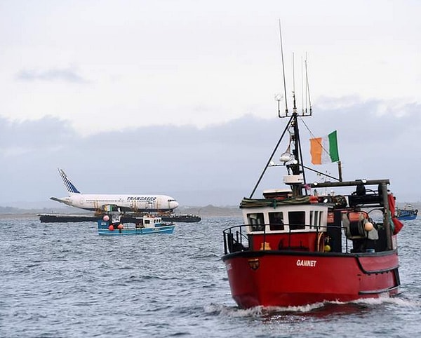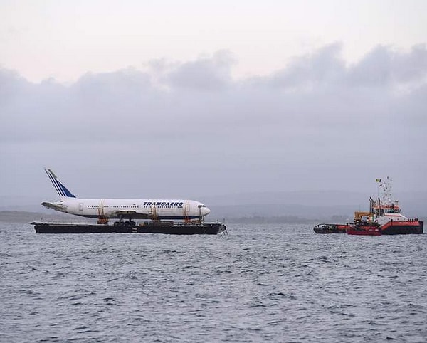 Списанный Боинг 767 не летит по небу, а... плывёт по воде. Старый 48,5-метровый самолёт российской компании Трансаэро взял курс на экстерриториальные воды после шести часов погрузки на баржу неподалёку от Шаннонского Аэропорта в графстве Клэр, Ирландия.