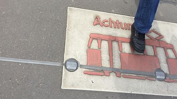 Трамвай в Германии отличается необычайной тишиной, в связи с чем пешеход почти не слышит его приближения и ориентируется на светофор. Но только не мобильные зомби. Для преотвращения аварийных ситуаций (а они, к сожалению, уже имели место) было решено отметить переход через рельсы светодиодными фонариками.