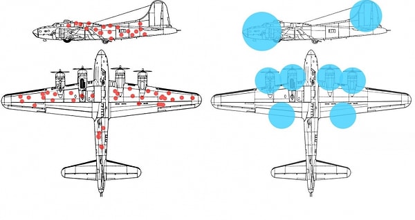 А теперь немножко истории. Данная ошибка существовала в жизни человека с самых древних времён. Но широкого признания она обрела после Второй Мировой Войны. Американские инженеры осматривали бомбардировщики, вернувшиеся с заданий и укрепляли те части конструкции самолёта, которые были сильнее всего повреждены. Ошибка в том, что, если аппарат смог вернуться на базу с повреждениями, значит в тех местах конструкция достаточно прочная. При этом игнорировались сбитые машины. Соответственно, причина их сбития оставалась неизвестной, а уязвимости конструкции не устранялись.