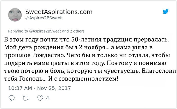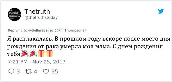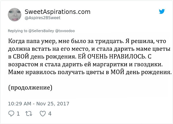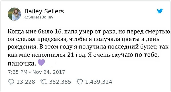 Отец четверых детей Майкл Уильямс Селлерс умер в 2013 году от рака поджелудочной железы, но перед смертью он решил заранее позаботиться о своей младшей дочери. Он сделал предзаказ в магазине цветов, чтобы его дочурке в день рождения присылали букет до тех пор, пока ей не исполнится 21 (это возраст совершеннолетия в США). И в этом году она получила его последний подарок.