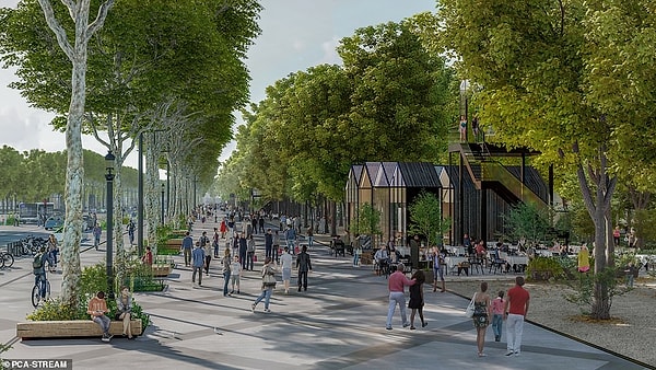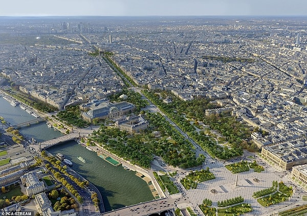 Champs Elysees (Елисейские поля), которые обычно забиты автомобилями, превратятся в 1,6 километровый участок зелени с туннелями из деревьев, зелеными насаждениями и пешеходными зонами.