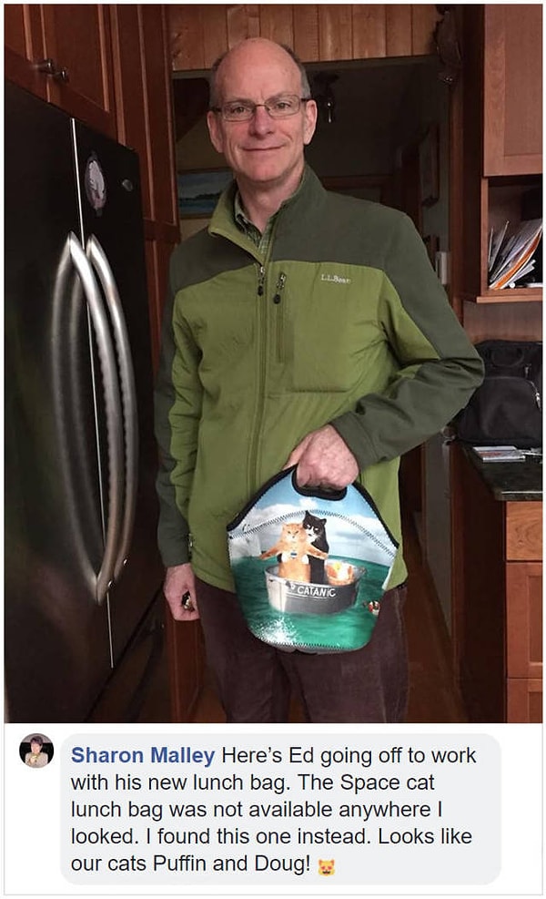 'Эд идет на работу с новым ланчбоксом. Я нигде не нашла ланчбокс с космическими котиками. Но вместо этого обнаружила такой. Они похожи на наших котов, Паффина и Дага'.
