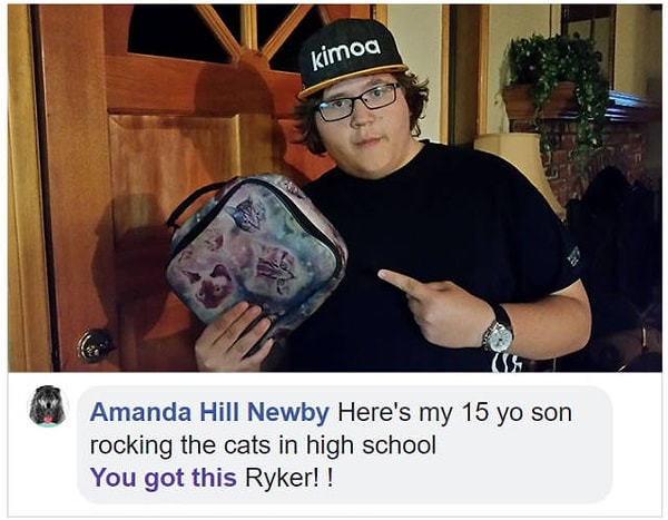 В США все, в том числе и школьники, носят обеды не в обычных контейнерах, как мы, а в удобных ланчбоксах. 10-летний Райкер – большой любитель кошек, поэтому он был в восторге, когда получил свой новый ланчбокс с котиками на космическом фоне. Однако то ли из-за цвета, то ли из-за наличия кошек другие мальчики из школы начали высмеивать его за то, что у него девчачий ланчбокс. Райкер даже хотел перестать носить обеды. И тогда его дядя Дэвид решил приобрести себе такой же, доказав, что настоящий мужчина может носить обед в чем угодно!