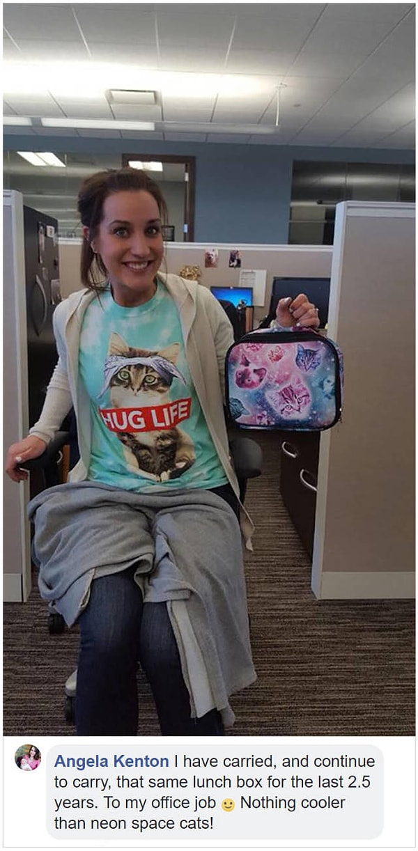 'Я носила и продолжаю носить тот же ланчбокс уже 2,5 года. На работу в офис. Нет ничего круче, чем неоновые космические котики!'