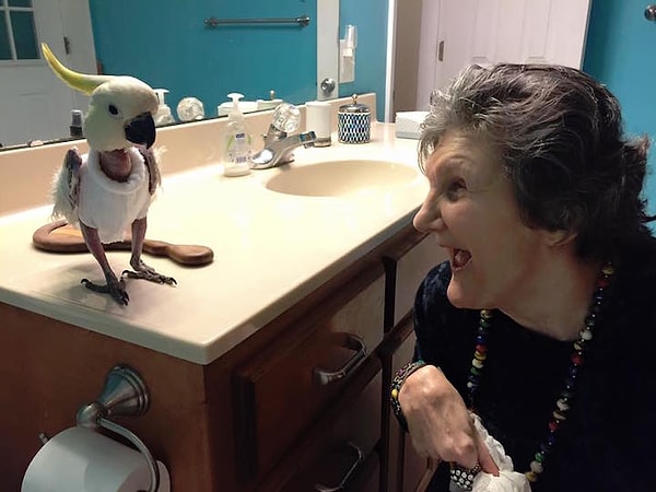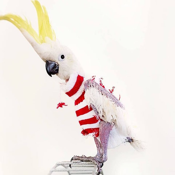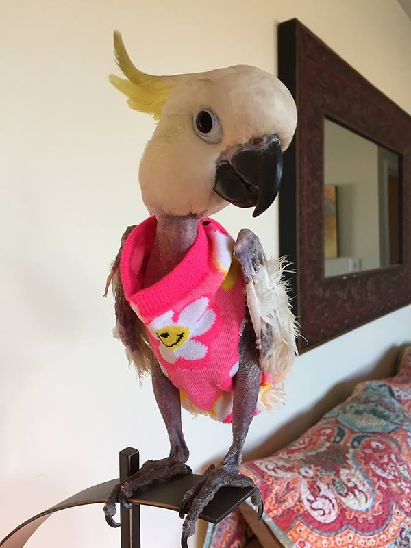 Какаду Яви сейчас живет в реабилитационном центре для попугаев в штате Канзас. Птичку буквально потрепала судьба — после жизни у прошлых хозяев от стресса Яви выдрала на своем теле практически все перья. Окруженная заботой орнитологов, Яви постепенно перестала бояться людей, но перья пока так и не отросли. Чтобы защитить птицу от холода, ей сшили свитера. И это очень мило!
