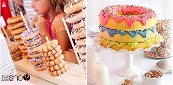 В данном случае можно забыть о торте и ограничиться веселыми пирамидками, состоящими из донатов. Примеров таких пирамидок в интернете великое множество.