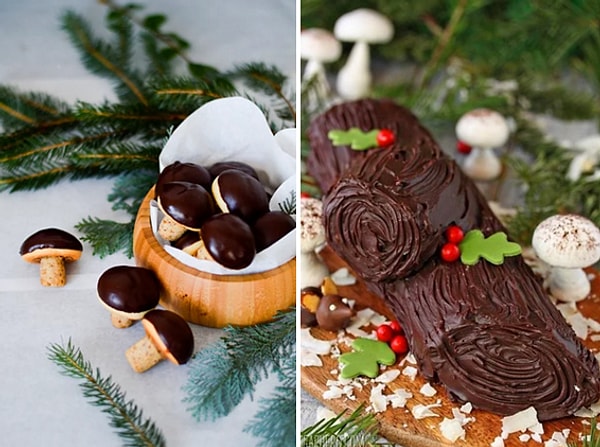 На столе должны быть орешки со сгущенкой, грибочки с шоколадом и прочие сладкие пирожные коричневого цвета.