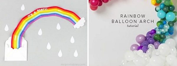 В качестве приглашений можно использовать конвертики, из которых внезапно выскакивает или высовывается радуга. А для оформления стен понадобятся разноцветные шарики.