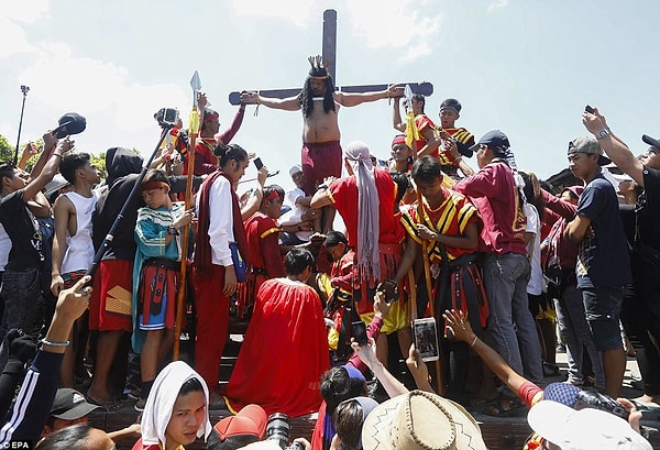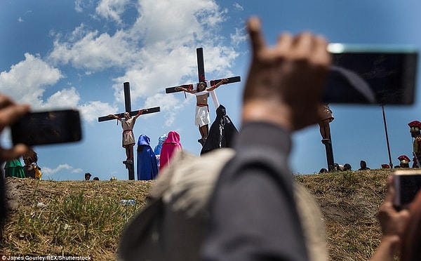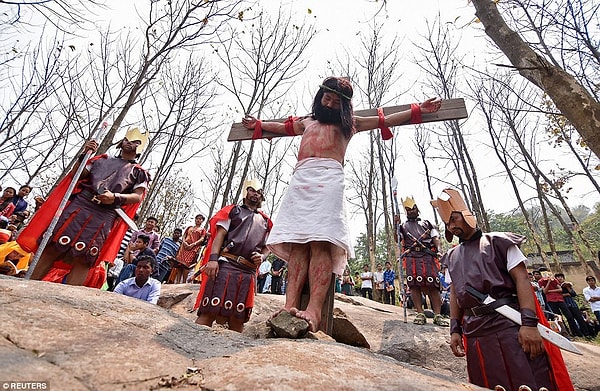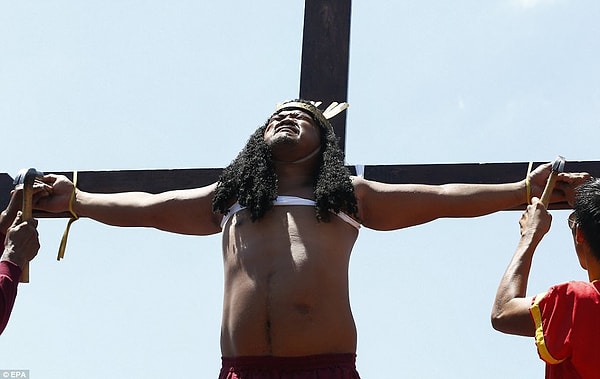 Здесь воссоздают полную картину распятия Христа и даже на самом деле прибивают ноги и руки участников к кресту.