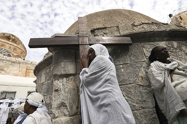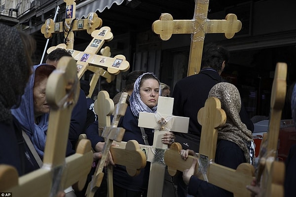 Те, кто не может войти в церковь, молятся на ступеньках храма в воспоминание о страданиях Христа.