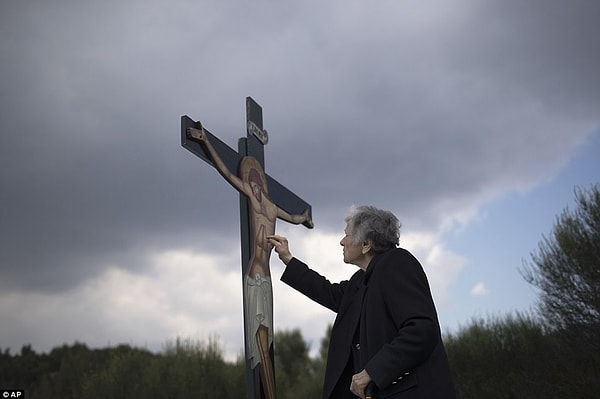 Дюжины людей собрались у изображения Христа, чтобы помолиться и вспомнить его великую жертву.