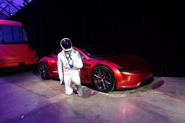 Перед запуском в 2018 году SpaceX загрузила машину различными пасхальными яйцами. За рулем находился одетый в скафандр манекен по прозвищу Стармен, а на приборной панели табличка с надписью «Не паникуйте», отсылка к знаменитому научно-фантастическому рассказу «Автостопом по Галактике». Также было устройство хранения данных с работами писателя-фантаста Исаака Асминова и табличка с именами тысяч сотрудников SpaceX.