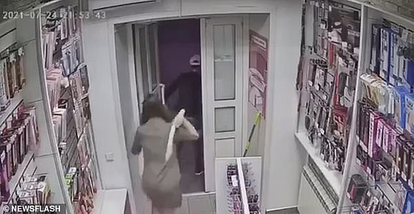 На кадрах видеонаблюдения из секс-шопа в городе Новокузнецк Кемеровской области видно, как продавщица бьет «грабителя» дилдо.