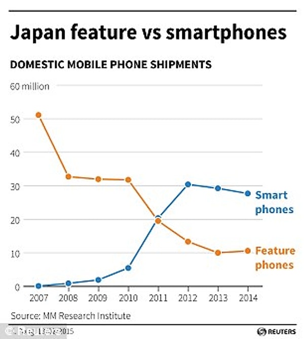 Рынок классических кнопочных телефонов, несмотря на все ожидания, несколько вырос за последние пару лет. На графике показаны объёмы продаж для Японии: оранжевая линия — кнопочные телефоны, синяя — смартфоны. Рост спроса на последние замедлился, в Японии в 2014 было продано 27,7 млн смартфонов (снижение на 5,3% к 2013), а кнопочные телефоны, напротив, начали возвращать свои позиции: 10,6 млн (рост на 5,7% к 2013).