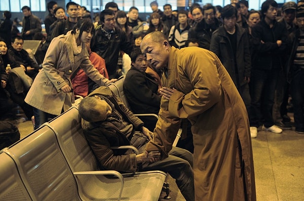 Китайский священник молится за скончавшегося пассажира в зале ожидания на станции метро.