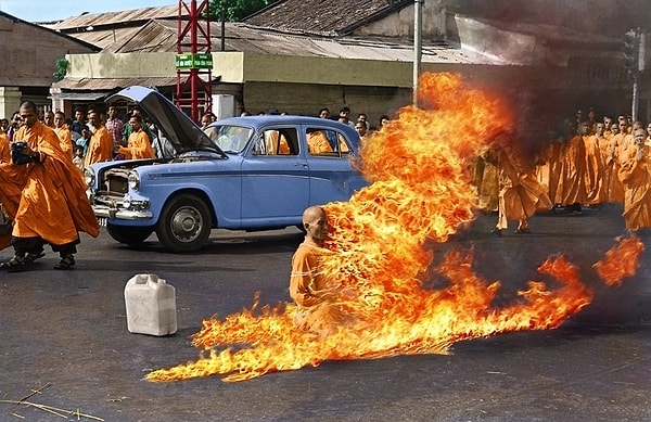 Одна из самых известных фотографий столетия. Буддийский монах Тхить Куанг Дык (Thich Quang Duc) поджег себя с целью протеста против правительства Южного Вьетнама, которое издевалось над священнослужителями. Сгорая в огне, он практически не издавал звуков и не двигался.