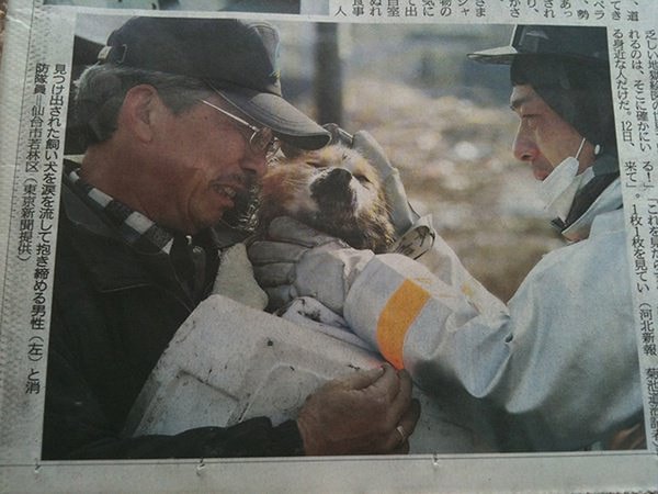Японец проливает слезы радости - его собаку спасли во время цунами в 2011 году.