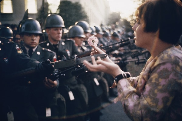 Молодая пацифистка Джейн Роус Касмир (Jane Rose Kasmir ) в рамках протеста Вьетнамской войны протягивает солдатам цветок. Эта фотография стала символом.