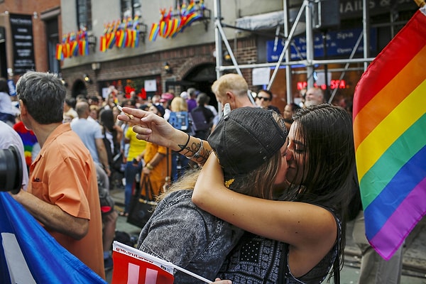 Около бара «Стоунволл-Инн» в Гринвич-Виллидж, Нью-Йорке после того, как объявили, что Верховный суд разрешил однополые браки по всему США. 26 июня, 2015 г.