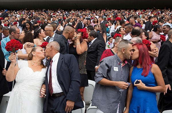 Около 400 пар поженились на стадионе «Арена Коринтианс» во время проведения массовой бесплатной церемонии бракосочетания в Сан-Паулу. Бразилия, 26 сентября, 2015 г.