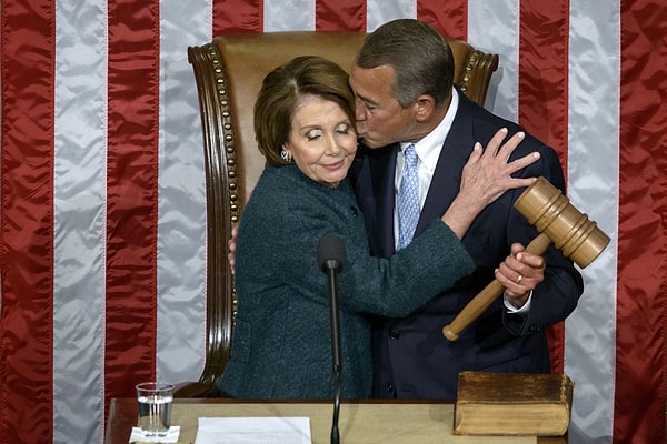 Лидер фракции меньшинства Нэнси Пелоси передают молоток бывшему спикеру палаты Джону Бейнеру во время церемонии присяги в Палате представителей США. 6 января, 2015 г.