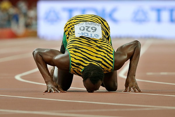 Усэйн Болт празднует свою победу в забеге на 200 метров на чемпионате мира по легкой атлетике. Национальный стадион в Пекине, Китай, 27 августа, 2015 г.