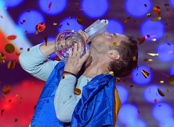 Монс Сельмерлёв, певец из Швеции, празднует свою победу на «Евровидение 2015». Вена, 24 мая.