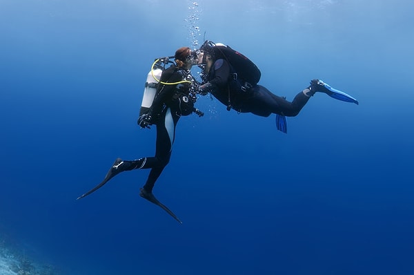 Пара дайверов в Индийском океане. Мальдивы, 26 сентября, 2015 г.