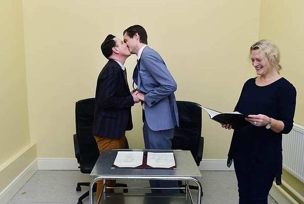 Новобрачные Ричард Доулинг и Кормак Голлогли, ставшие первой однополой парой, заключивший брак в Ирландии. 17 ноября, 2015 г.