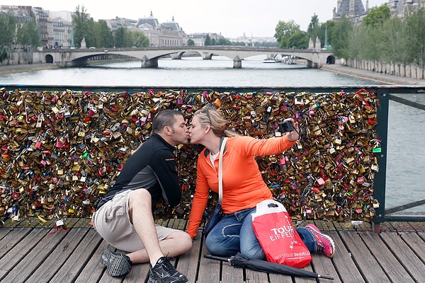 На фоне замочков, оставленными влюбленными на мосту Искусств. Париж, 31 мая, 2015 г. 1 июня все замки (их было более 700,000 ) были сняты из-за угрозы безопасности моста.
