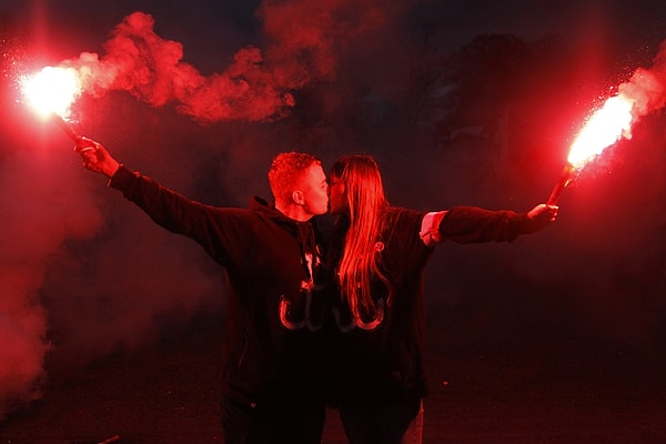 Держа в руках сигнальные ракеты в память о погибших в войнах польских солдатов. Варшава, Польша. 11 ноября, 2015 г.