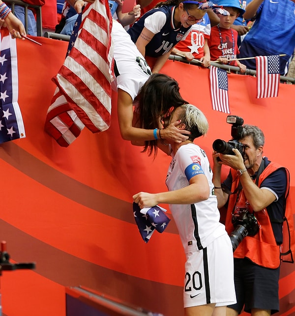 Американская футболистка Эбби Вамбах со своей женой Сарой Хафман после победы на чемпионате мира по футболу среди женщин. Ванкувер, Канада, 5 июля.