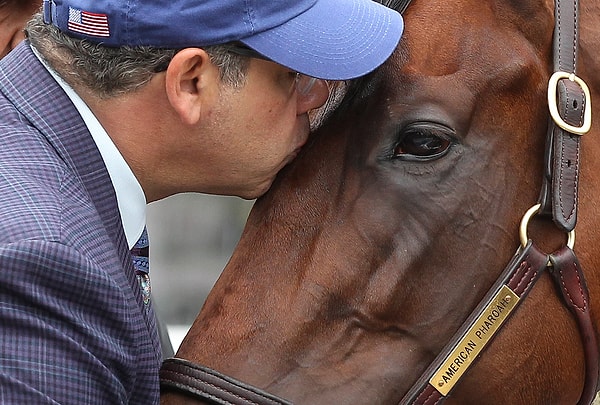 Aмерикан Фэрoу после забега получает поцелуй от своего хозяина Ахмеда Заяна. Белмонт Парк, Нью-Йорк, 5 июня. Aмерикан Фэрoу выиграл серию скачек Тройной Короны и “Breeder's Cup Classic” в 2015 г.
