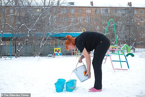 Воспитатели детских садов обливаются ледяной водой в Сибири, Россия. Считается, что этот процесс сохраняет здоровье детей и предотвращает инфекции.