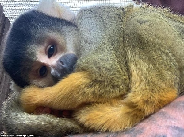 Крошечная обезьяна-белка в парке дикой природы Мого отдыхает на руках у Чада. Он сказал, что его самые ценные моменты работы в зоопарке связаны с рождением животного. Он объяснил: «Это такой радостный случай и что-то, что мне никогда не надоест».