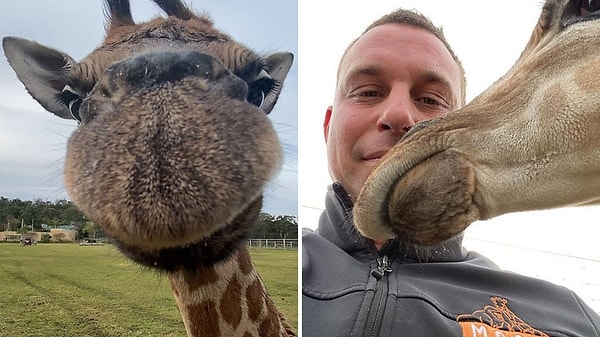 Слева Чад позирует для селфи с молодым жирафом Твигой.