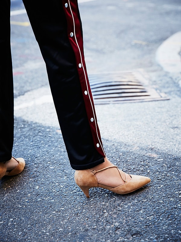 В наше время особенно дерзким ходом станет сочетать киттен хилс с джинсами-бойфрендами или брюками с лампасами в стиле спорт-шик.