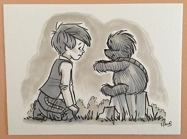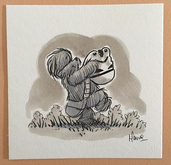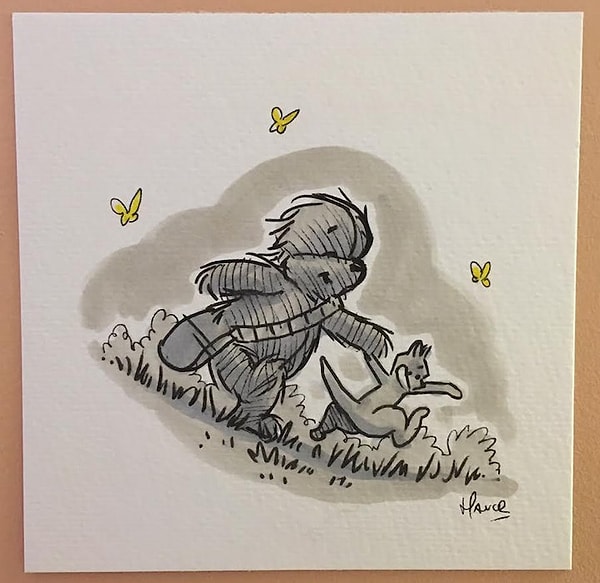 Появление этого нового героического лица мы обязаны американскому художнику-иллюстратору Джеймсу Хэнсу. Иллюстратор из Флориды соединил всеми любимую книгу Алана Милна и пользующихся бешеной популярностью фильмы Джорджа Лукаса и поместил их в одну Вселенную, нарисовав Пуха в виде маленького добродушного Чубакки.