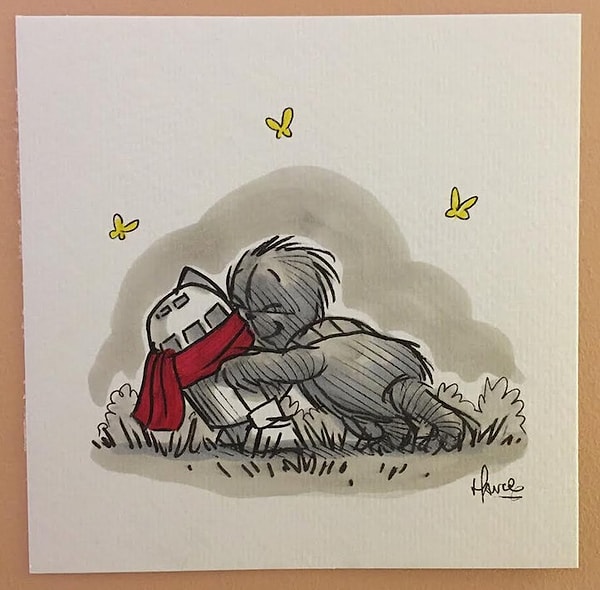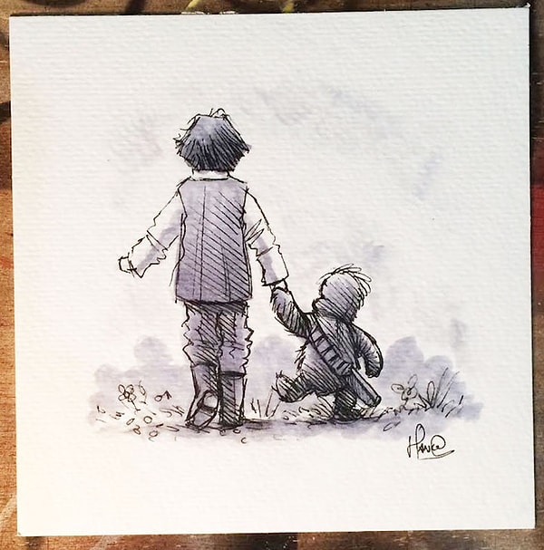 Каждая из этих работ копирует стиль Эрнеста Шепарда, художника, впервые нарисовавшего Винни-Пуха и всех его друзей. Несмотря на то, что Джеймс Хэнс изменил персонажей старой сказки, история на его картинках все равно осталась прежней историей о веселой дружбе мальчика и плюшевого медведя.