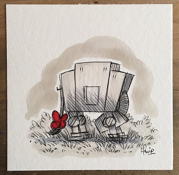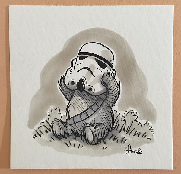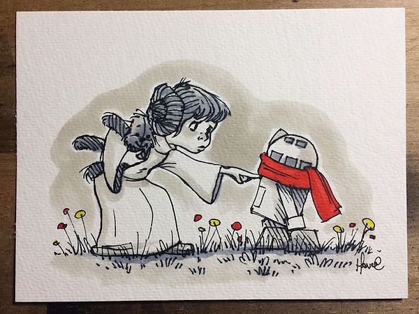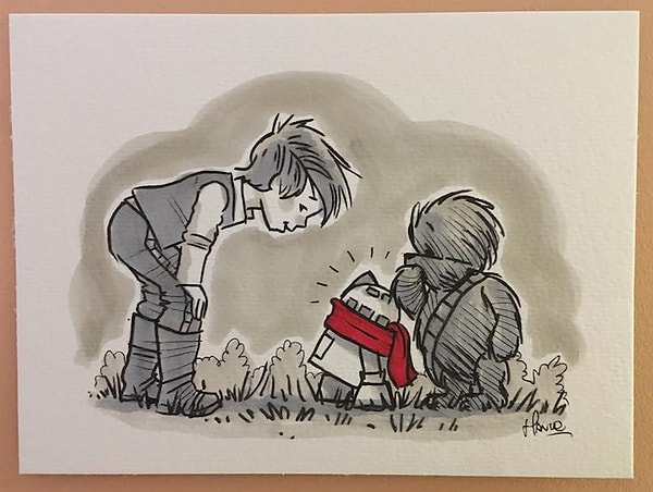 Эта фантастическая серия включает в себя и других персонажей “Star wars”: Хана Соло в виде друга Винни-Пуха, Кристофера Робина; печального Иа-Иа, как имперского шагохода AT-AT (у него даже есть хвост с повязанным бантиком) и других героев знаменитой саги.