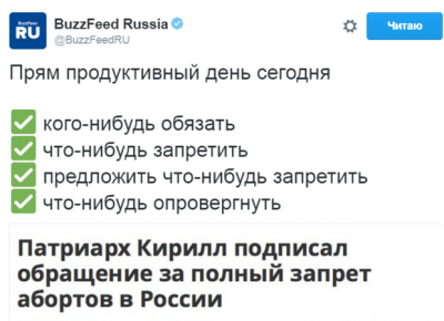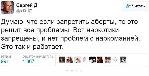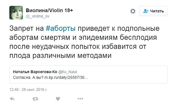 Известно, что накануне патриарх Московский и всея Руси Кирилл подписал петицию о запрете в России абортов. Также поддержала запрет абортов и уполномоченный при Президенте России по правам ребенка Анна Кузнецова, добавив, что этот вопрос требует системного подхода.