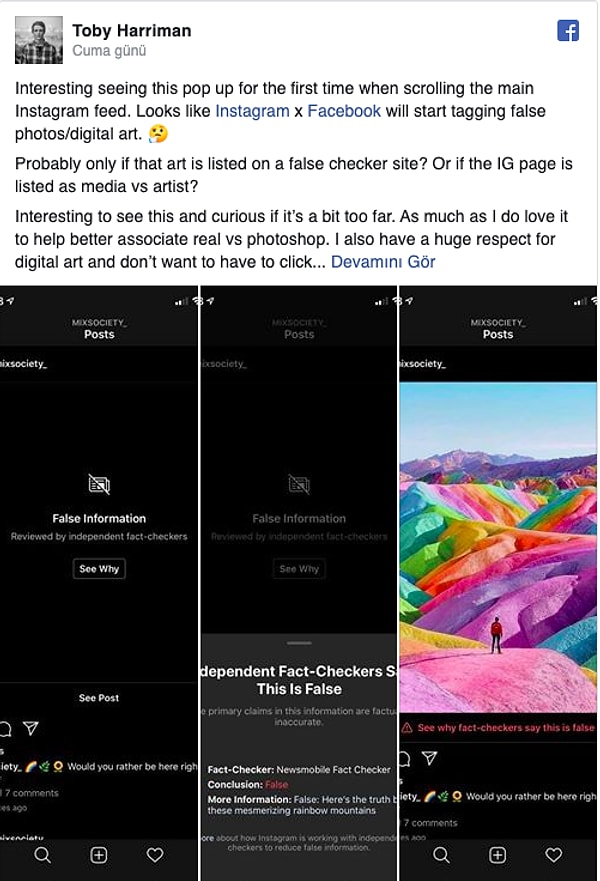Эта новая функция была обнаружена фотографом Тоби Харриманом, живущим в Сан-Франциско, США. При размещение на платформе Instagram отфотошопленной фотографии, пользователю приходит предупреждение о 'некорректной информации', также снимок не появляется в поисках по хэштегу и в разделе 'Найти'.