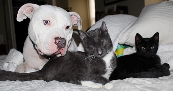 Три ослепленные кошки нашли поддержку и заботу у двух питбулей