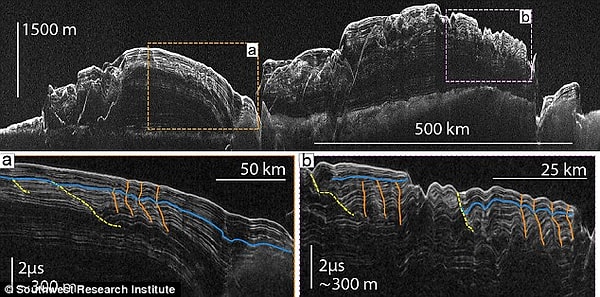 Используя данные с насовского Mars Reconnaissance Orbiter, учёные нашли свидетельства о ледниковом периоде в строении марсианского льда. Выше синей линии на рисунке — лёд современный, ниже — накопленный ранее.